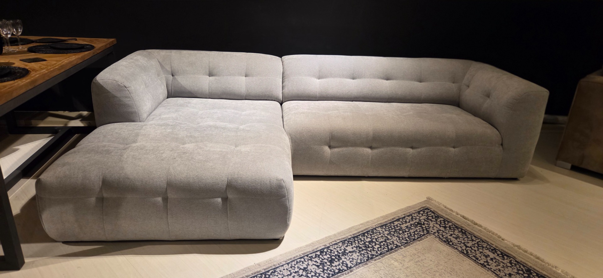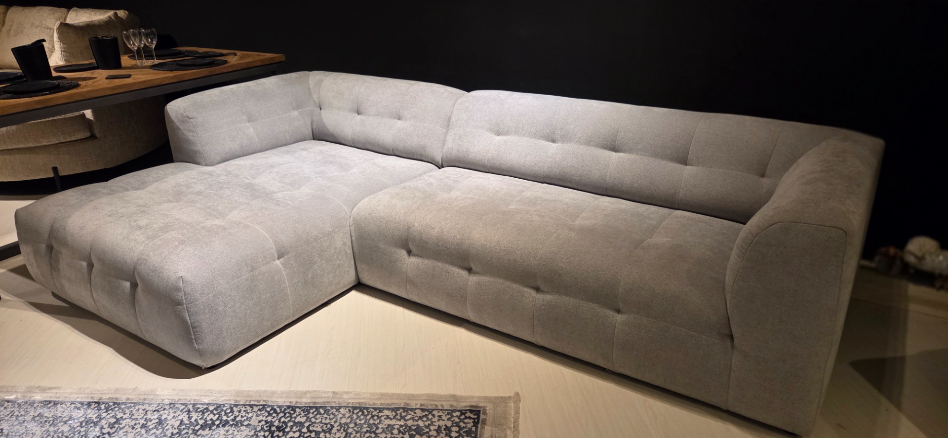 De strakke stoffering en de zorgvuldige verwerking van de diepgetrokken knopen benadrukken de kwaliteid van dit meubel.