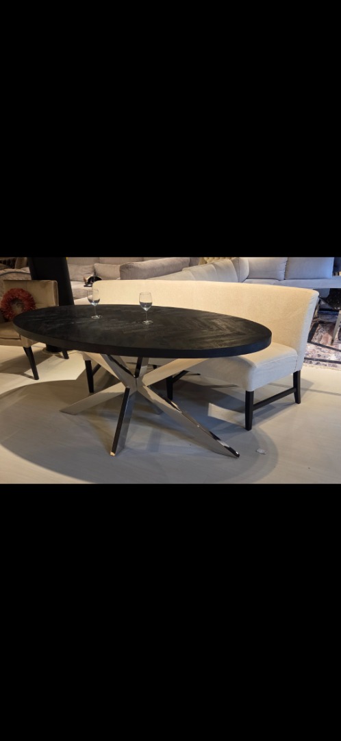 Het diepzwarte tafelblad is ingelegd in een klassiek visgraatpatroon, wat zorgt voor een dynamisch en luxueus relief. Het robuuste blad wordt ondersteund door een modern stervormig onderstel van hoogwaardig chroom.