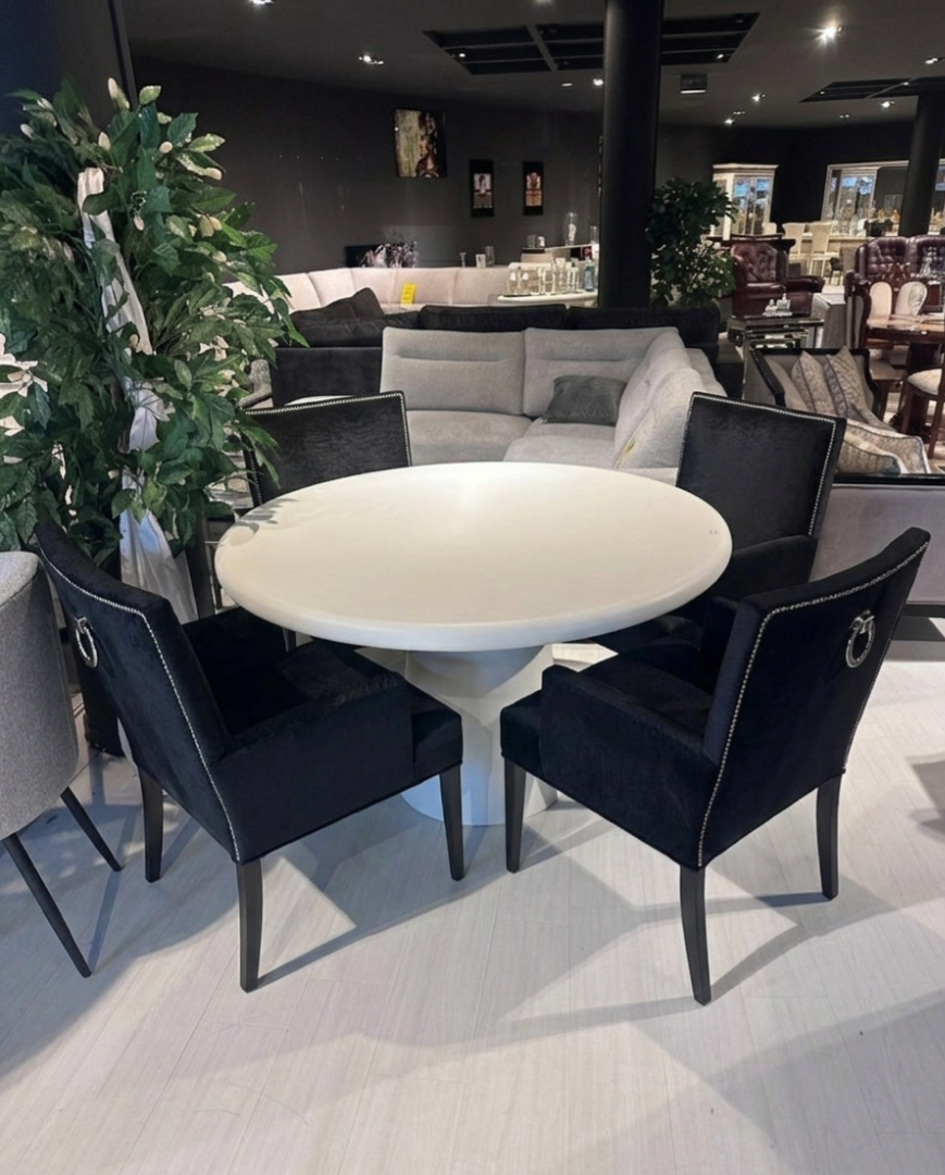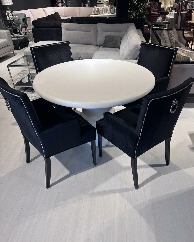 De set wordt gecompleteerd door vier exclusieve zwarte stoelen. Deze stoelen zijn ontworpen met oog voor detail.