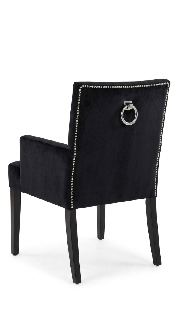 De stoel is bekleed met een rijke, diepzwarte velvet (fluwelen) stof die zorgt voor een zachte touch en een chique glans. De rugleuning is subtiel geaccentueerd met zilverkleurige spijkerkopjes.