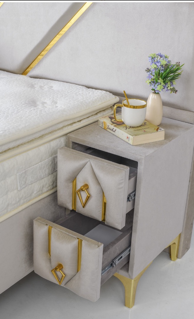 Boxspring DERRY is bestelbaar in "Beige & Goud" of "Antraciet & Zilver" combinaties.